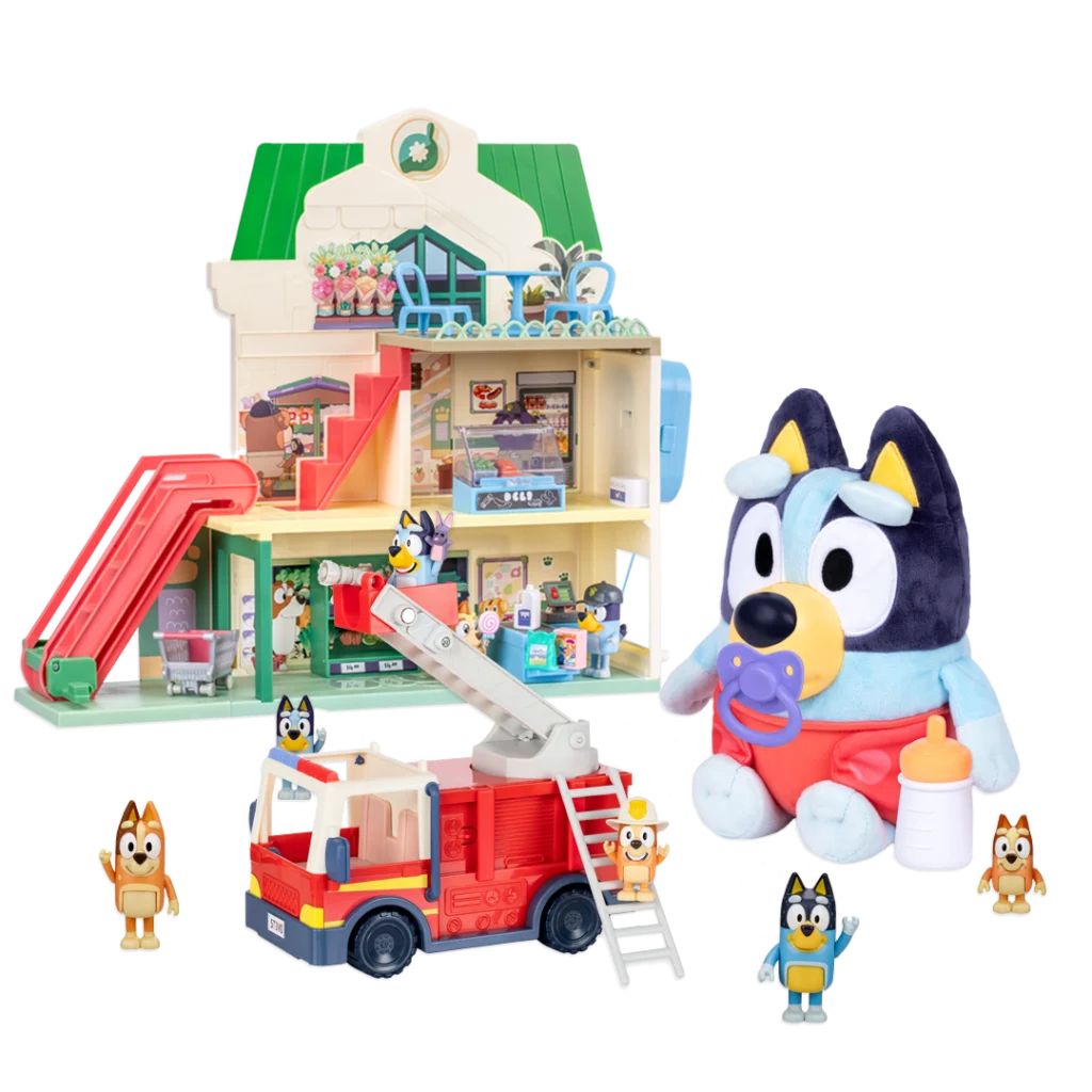 Do you always watch the adventures of Bluey and her family? Now play with all the Bluey toys and experience your own adventures! With the play figures of Bluey, Bingo, Chili, and Bandit, you can play in the Playhouse, which is detailed with many accessories. Or take a ride in the family car to go surfing for the day. All figures are also available in high-quality plush, perfect for cuddling. Discover all the Bluey toys! Bluey toys are part of Moose Toys.