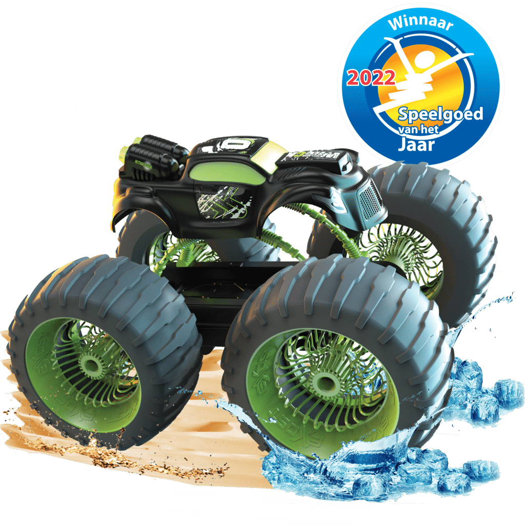In 2022, the Exost Rhino Wave Amphibious Monster Truck was voted Toy of the Year. The Exost RC Rhino Wave is bold, large, and can handle any terrain! Thanks to its special features, it earned the Toy of the Year 2022 title in the Vehicles category. This 4×4 Off-Road Monster Truck, scaled at 1:8, drives not only on land but also on water! With its durable, lightweight tires and anti-shock suspension, it easily performs 360-degree spins and reaches speeds of up to 30 km/h. It is equipped with a twin turbine system, giving the Rhino extra power and speed in the water.