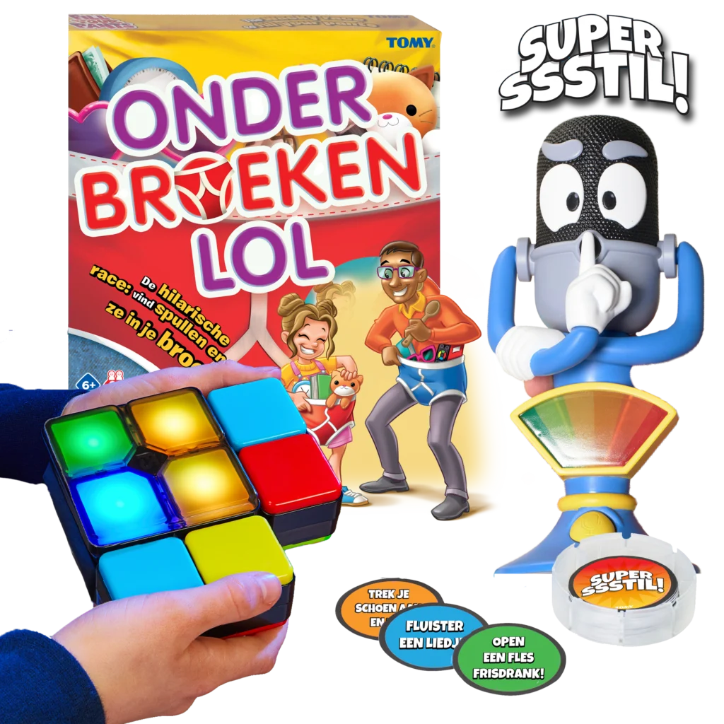 Of je nu zin hebt in een snelle solo-uitdaging of een hilarisch spelletje met het hele gezin: wij hebben het allemaal. Van spellen waar je slim van wordt tot spellen die je buikspieren trainen van het lachen. Ben jij een snelle en slimme speler? Daag dan jezelf of vrienden uit met het spel Flipslide: Slide, flip en match de zijblokken om de kleuren zo snel mogelijk te matchen met de oplichtende kleuren! Na elke voltooide zet veranderen de lichten, waarna je de zijblokken weer moet draaien en/of schuiven om de volgende lichtpuzzel op te lossen. Speel je liever samen een opdrachtenspel met vrienden of familie? Dan zit je met Super Ssstil en Onderbroekenlol helemaal goed! Bij Super Ssstil moet je luidruchtige opdrachten, zoals ‘scheur een papier doormidden’ of ‘eet iets knapperigs’, zo stil mogelijk en binnen de tijd uitvoeren voor Mike de microfoon. Eén ritseltje of giecheltje en je bent af! Bij Onderbroekenlol voer je knotsgekke opdrachten uit in twee grote onderbroeken! Draai een kaart om en probeer zo snel mogelijk een item te vinden dat overeenkomt met de omschrijving op je kaart, stop deze in je grote onderbroek en laat iedereen lachen tot de tranen over de wangen rollen!